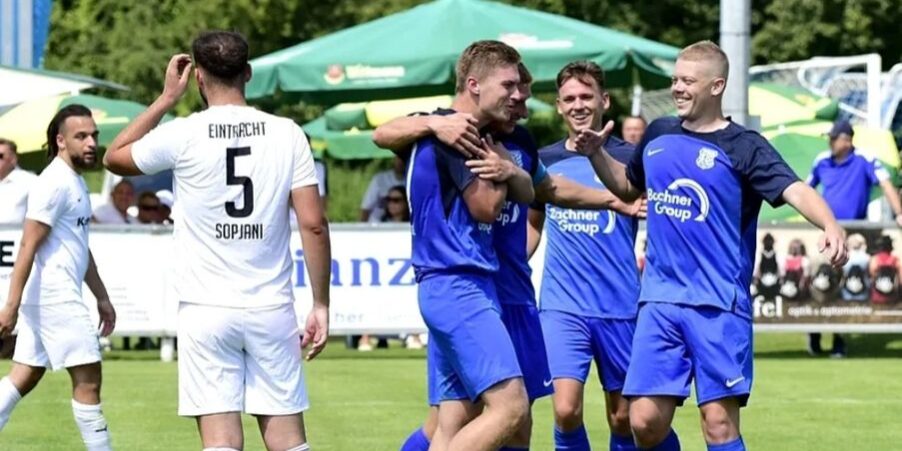 Teisbach(dw) // Äußerst erfolgreich haben die Jungs der Bezirksligamannschaft ihr erstes Pflichtspiel vor heimischen Publikum am Samstagmittag im Rahmen des Sportplatzfestes gemeistert. Durch einen auch in der Höhe absolut verdienten 6:1 Kantersieg gegen relativ schwach auftretende Gäste aus Landshut sicherte man sich den ersten Dreier der Saison. Dabei hat man sogar noch rund ein halbes Dutzend bester Torgelegenheiten liegen gelassen, das Ergebnis hätte bei konsequenterer Chancenverwertung noch höher ausfallen können. Spielerisch war es über weite Strecken eine solide Vorstellung, lediglich unmittelbar nach dem Seitenwechsel kamen die Gäste besser auf, richtige Torgefahr konnte die Eintracht aber über die gesamte Spielzeit kaum entwickeln. Im Vergleich zur Auftaktniederlage in Straubing änderte das Trainerduo die Startformation auf zwei Positionen: Sebastian Weber rückte wieder in die Innenverteidigung, Andi Mittermeyer bekam den Startplatz auf der linken Außenbahn. Unter der stets souveränen Spielleitung von Schiedsrichter Christoph Kirchberger begannen die Weiß-Blauen sehr motiviert und zeigten vor allem in den ersten 30 Minuten eine überzeugende Leistung. Nach einer Viertelstunde jubelte man zum ersten Mal, als Florian Wischinski nach einem Diagonalball von Franz Gruber zum 1:0 einnetzte. Bereits zuvor hatte man zwei sehr gute Einschussmöglichkeiten.